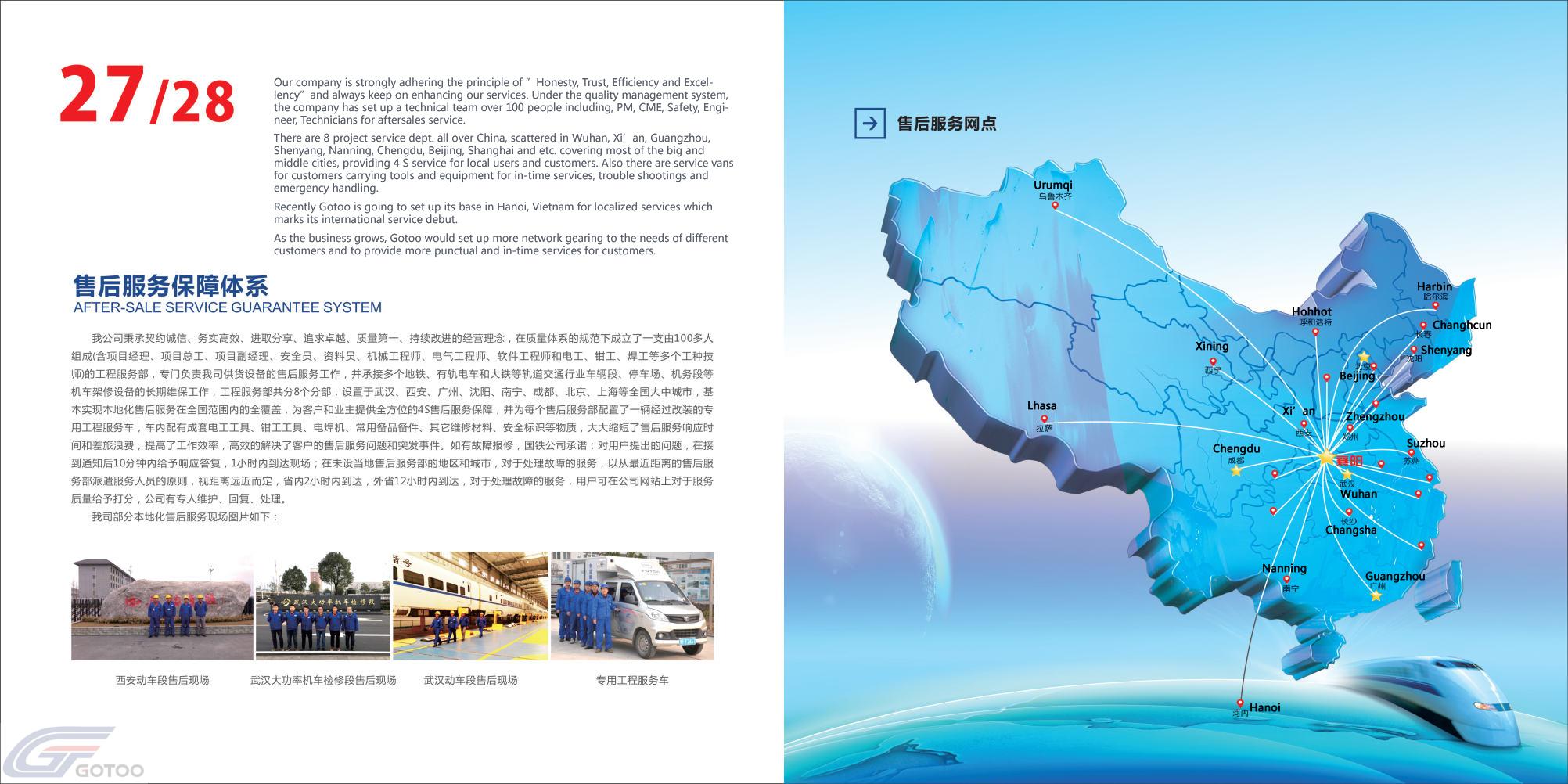 The 4S is a service method, including sales, spare parts, sales service, and survey(information feedback). Gotoo had integrates four functions into one as a professional railway filed service company. Gotoo has established a powerful operation and maintenance service center with a support team of more than 100 people. There are currently 8 engineering service departments.